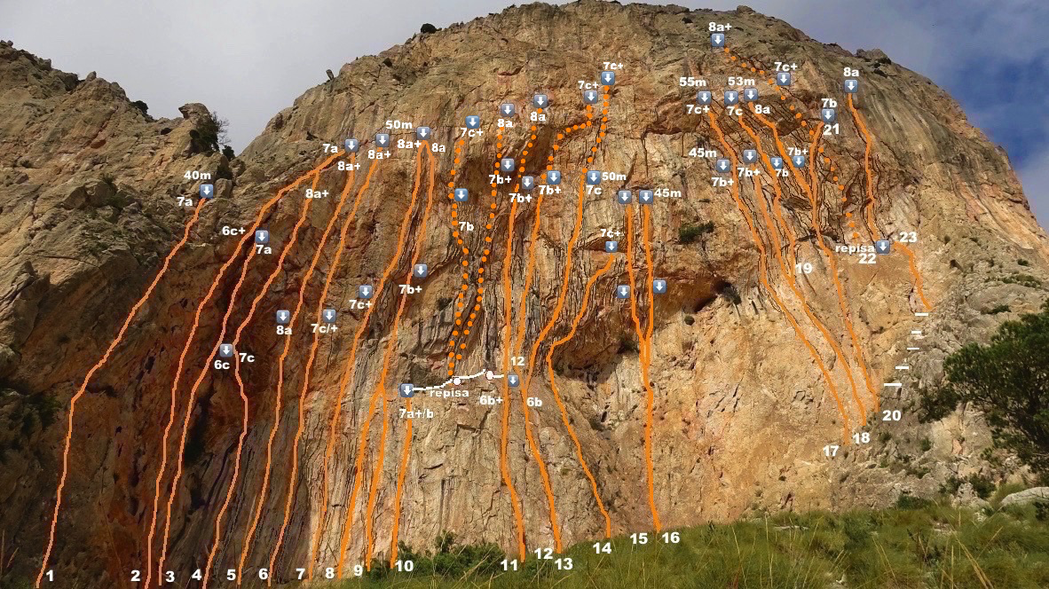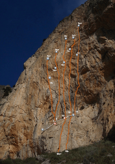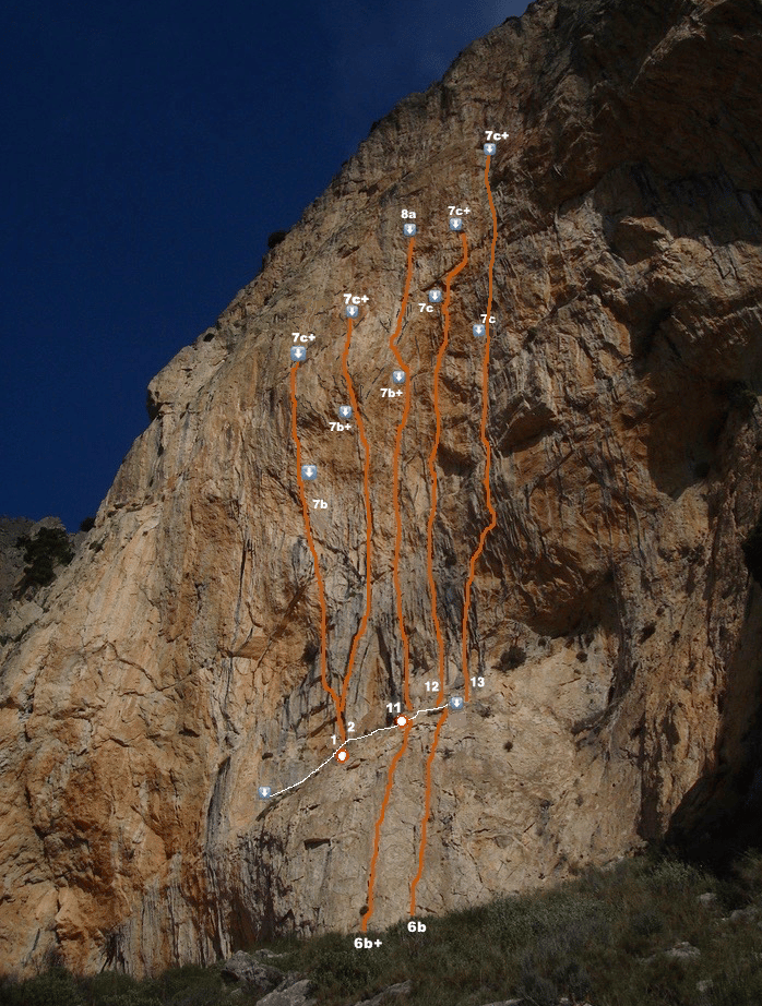 Aquí se describen los recorridos con la idea de escalada deportiva hasta los 50m y volver al suelo. Para ver los croquis hacia cumbre abrir el enlace Multipitch.