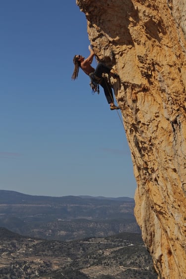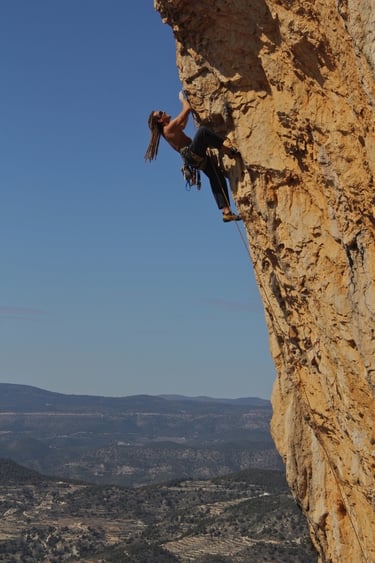 Foto: Escalando los primeros metros de "Rock ´wall" llegando a la repisa donde podemos montar reunión o continuar escalando hasta un descuelgue intermedio a 50m del suelo, podemos hacer lo mismo en las vías: "Motörhead" y "Jugando con el diablo"