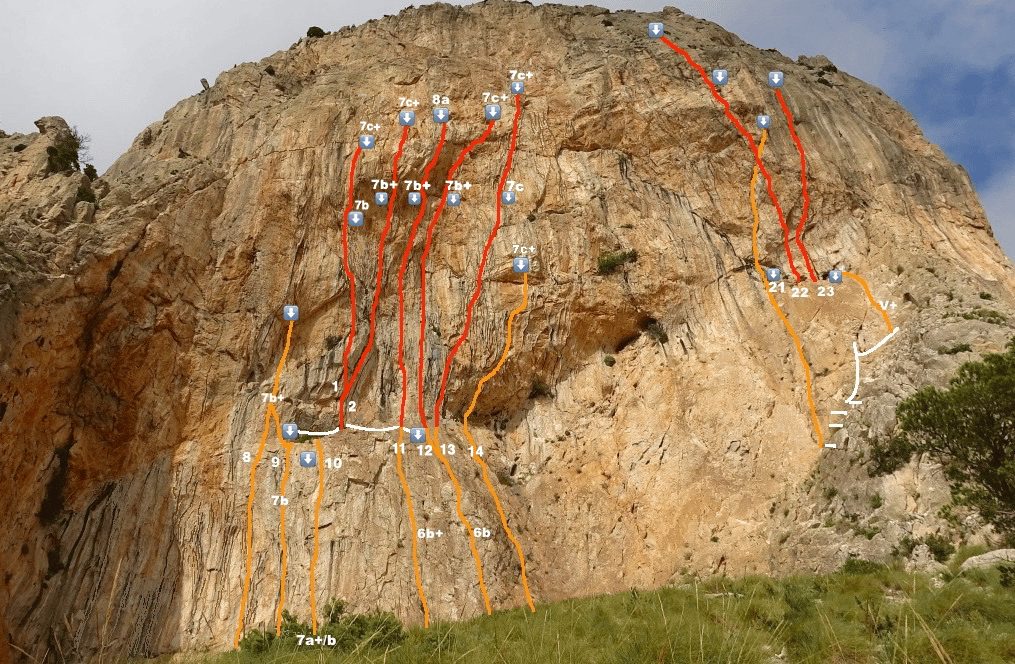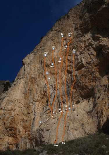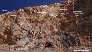 Aquí se describen los recorridos con la idea de escalada deportiva hasta los 50m y volver al suelo. Para ver los croquis hacia cumbre abrir el enlace Multipitch.
