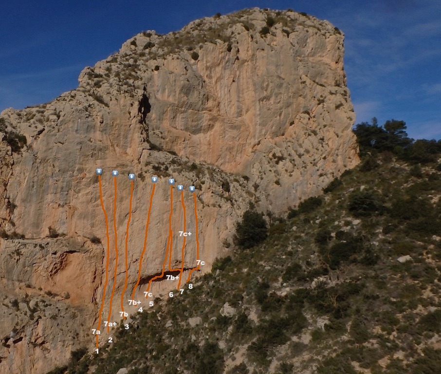 Un rincón agradable con unas vistas espectaculares de la costa de Alicante, donde podemos disfrutar de una escalada muy intensa con recorridos de unos 20m empezando con desplome de agujeros y columnas y luego más vertical con pequeñas regletas con grados que pueden parecer muy ajustados.