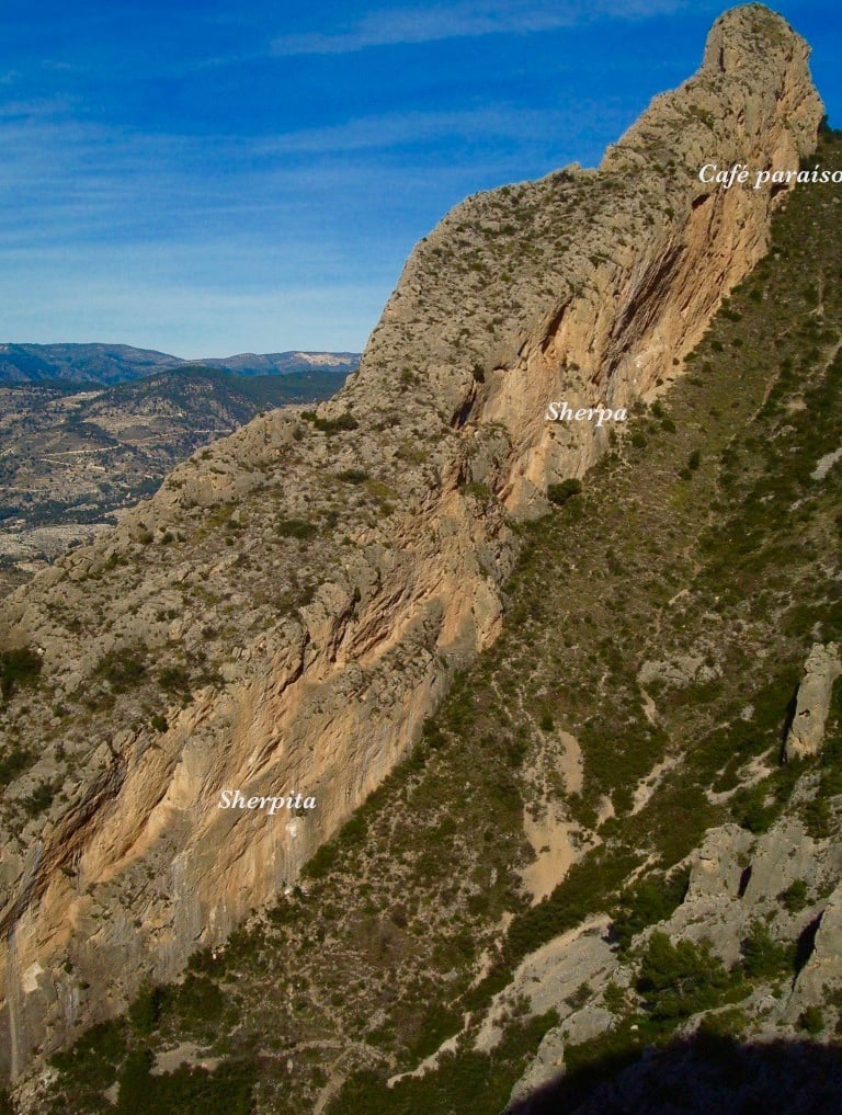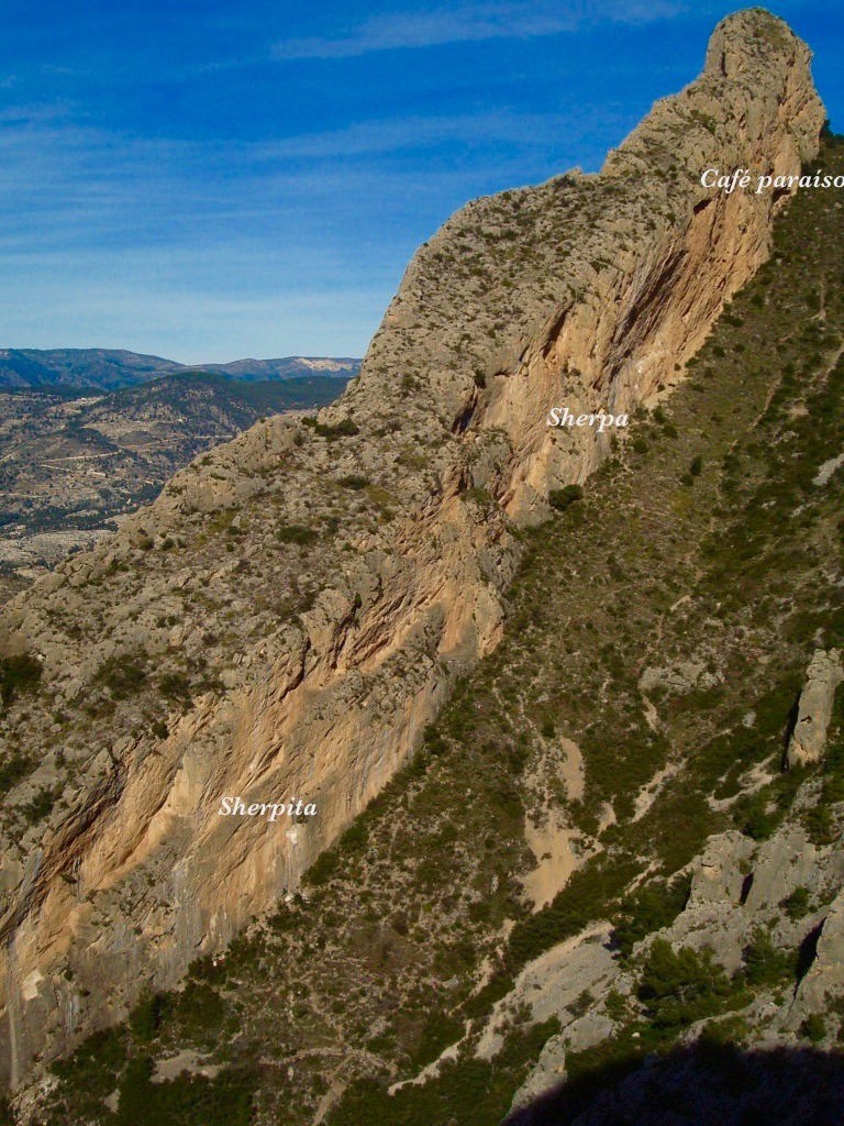 Orientación Este, tendremos sombra a partir de las 14h ,el Sherpa está más expuesto al aire, los días de mucho viento encontramos refugio en el Café paraíso. Desde el parking caminar por la pista de tierra 5 min y al final de la rampa sale un camino a la derecha que lleva al barranco del caldero y vemos la Peña Alicante, seguir el camino que va por medio del barranco.