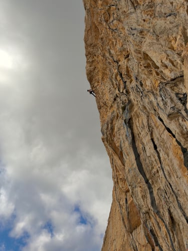 Foto: Escalando los primeros metros de "Rock ´wall" llegando a la repisa donde podemos montar reunión o continuar escalando hasta un descuelgue intermedio a 50m del suelo, podemos hacer lo mismo en las vías: "Motörhead" y "Jugando con el diablo"