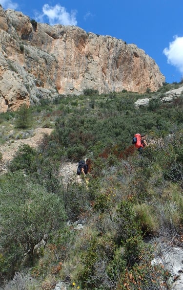 Desde el parking caminar por la pista de tierra 5 min y al final de la rampa sale un camino a la derecha que lleva al barranco del caldero y vemos la Peña Alicante, seguir el camino que va por medio del barranco , en total 35min, 1´7km y 300m de desnivel, situado a 830m altitud.
